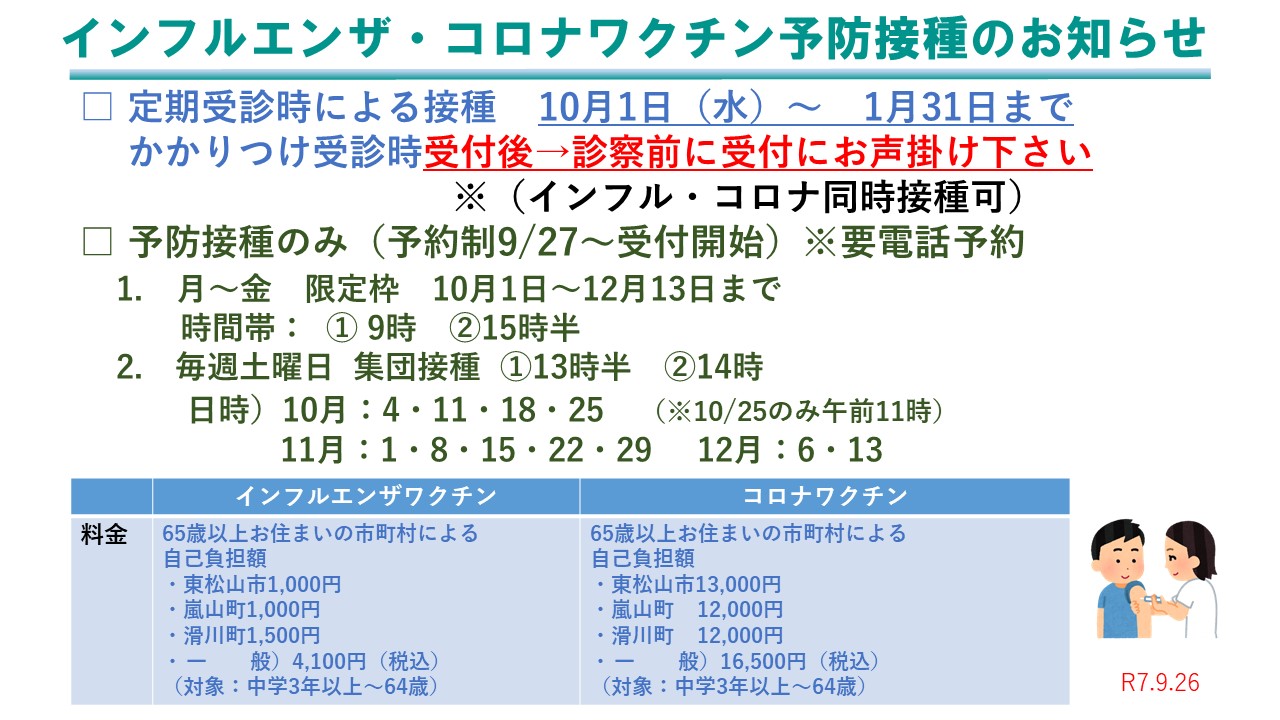 インフルエンザ・コロナワクチン予防接種を実施します。